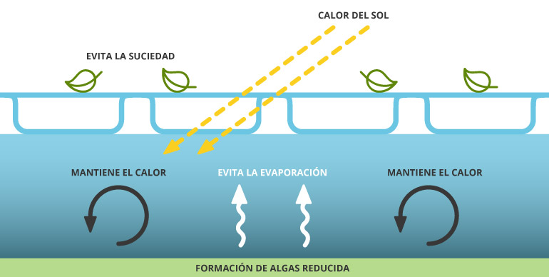 Las burbujas de aire de la lona absorben la energía térmica del ambiente y transfieren el calor al agua, manteniendo o aumentando la temperatura de la piscina hasta 10ºC en un breve periodo de tiempo. Asimismo, el cobertor actúa como un aislante térmico durante la noche, por lo que reduce la pérdida de calor.