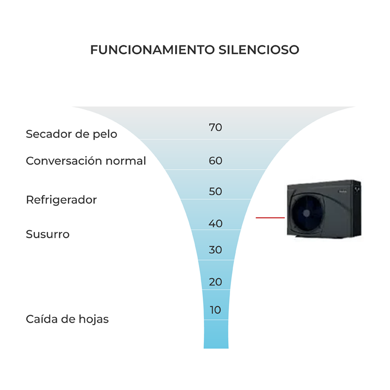 La tecnología Full-inverter permite un control preciso de la velocidad del compresor y del motor del ventilador al adaptar la potencia de la bomba continuamente. El rendimiento se optimiza en función de la temperatura del agua y las condiciones climáticas, proporcionando un funcionamiento eficiente, y silencioso. Al operar de forma variable, la bomba ajusta su capacidad para mantener la temperatura del agua reduciendo el consumo energético a largo plazo y generando menos ruido.