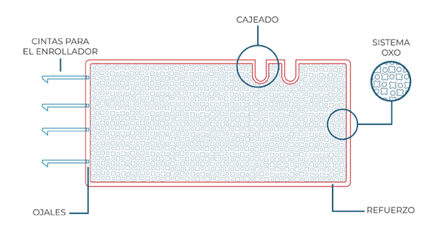 Uno de los laterales tiene refuerzo de PVC y ojales para engancharlo al enrollador | Los dos laterales tienen refuerzo de PVC y solo un ojal para engancharlo al enrollador | Todos los laterales tienen refuerzo de PVC y solo un ojal para engancharlo al enrollador |