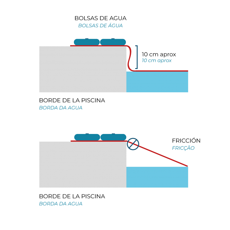 A cobertura é fornecida com todos os sacos de água necessários para a sua correta instalação, fabricados em PVC selado a quente com válvula dupla, resistentes a produtos com cloro e sal.