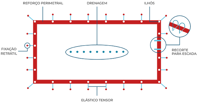 Ao encomendar a sua coberta de Inverno para piscina feita à medida, incluímos ilhós a cada 60cm. aproximadamente (dependendo da medida final necessária) em todo o perímetro, bem como as ancoragens e elásticos tensores necessários para a sua correcta instalação.