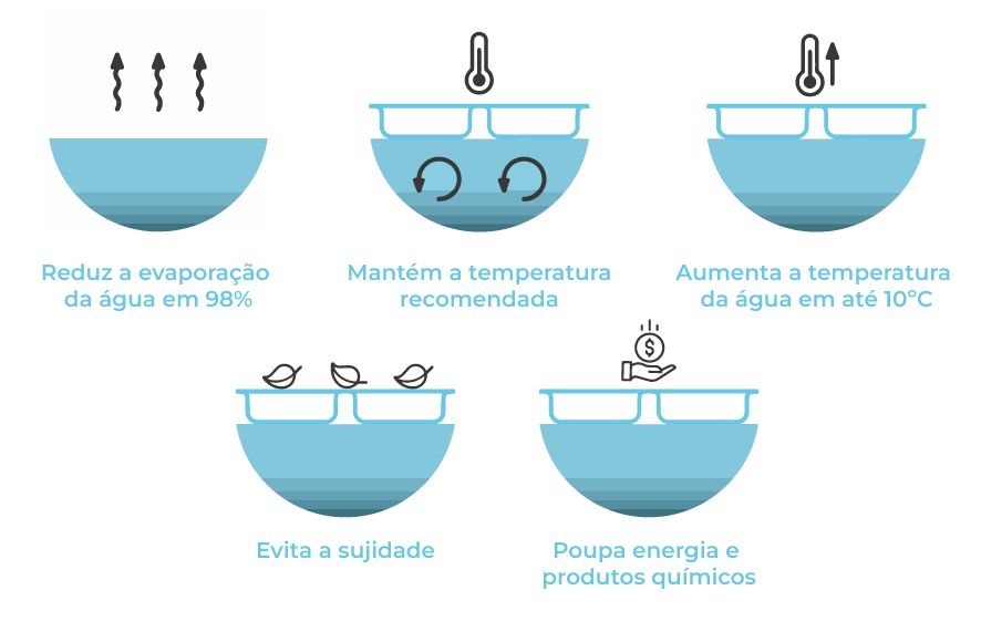 As outras características de ambos os tipos de coberturas térmicas são semelhantes: aumentam e mantêm a temperatura da água, evitam a evaporação e reduzem a utilização de produtos químicos.