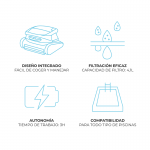 O robô de 7,5 kg está equipado com 2 motores, rastos de TPV de elevado coeficiente de atrito e um filtro de nylon e tecido com uma capacidade de 4,1 litros. A rotação a alta velocidade das pás do motor da bomba centrífuga twin-turbo patenteada gera uma força poderosa. O aparelho oferece uma potência de aspiração máxima de 320 litros por minuto.