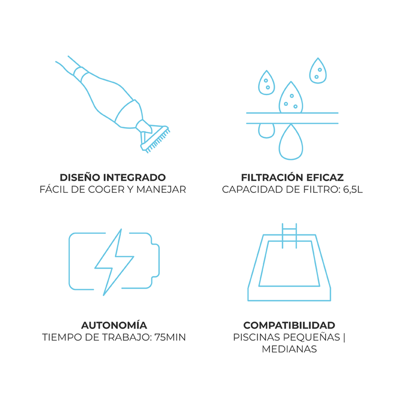 Este dispositivo é forte e duradouro, oferecendo uma limpeza rápida e eficiente. A instalação na saída da piscina é simples, sem a utilização de ferramentas. Os conectores são compatíveis com a maioria das piscinas.