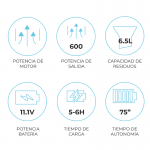 Este aparelho, com um tempo de carregamento de 5 a 6 horas, é composto por um sistema de aspiração lateral que canaliza os resíduos para zonas de grande potência para garantir a máxima eficácia. A sucção é constante e proporciona um resultado ótimo. A capacidade de filtragem é de 6,5 litros.